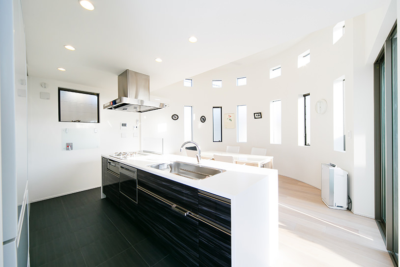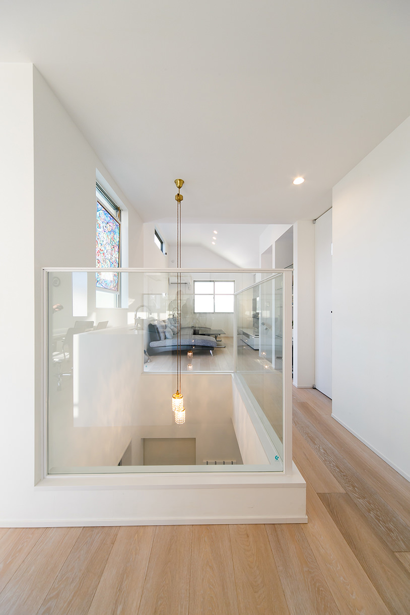 リビング・キッチンスペースには吹き抜けの手すりをガラスにしたり、温かみのある床材を使用して家族の温もりが感じられる工夫も行っています。