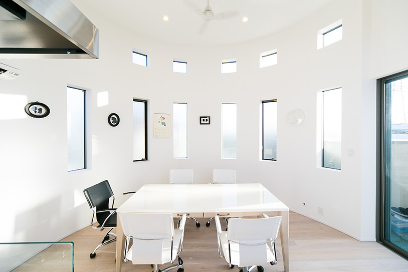 外観の一部分をR状としていることで個性的な印象とまたそのカタチを活かす縦張りのタイルを使用しています。