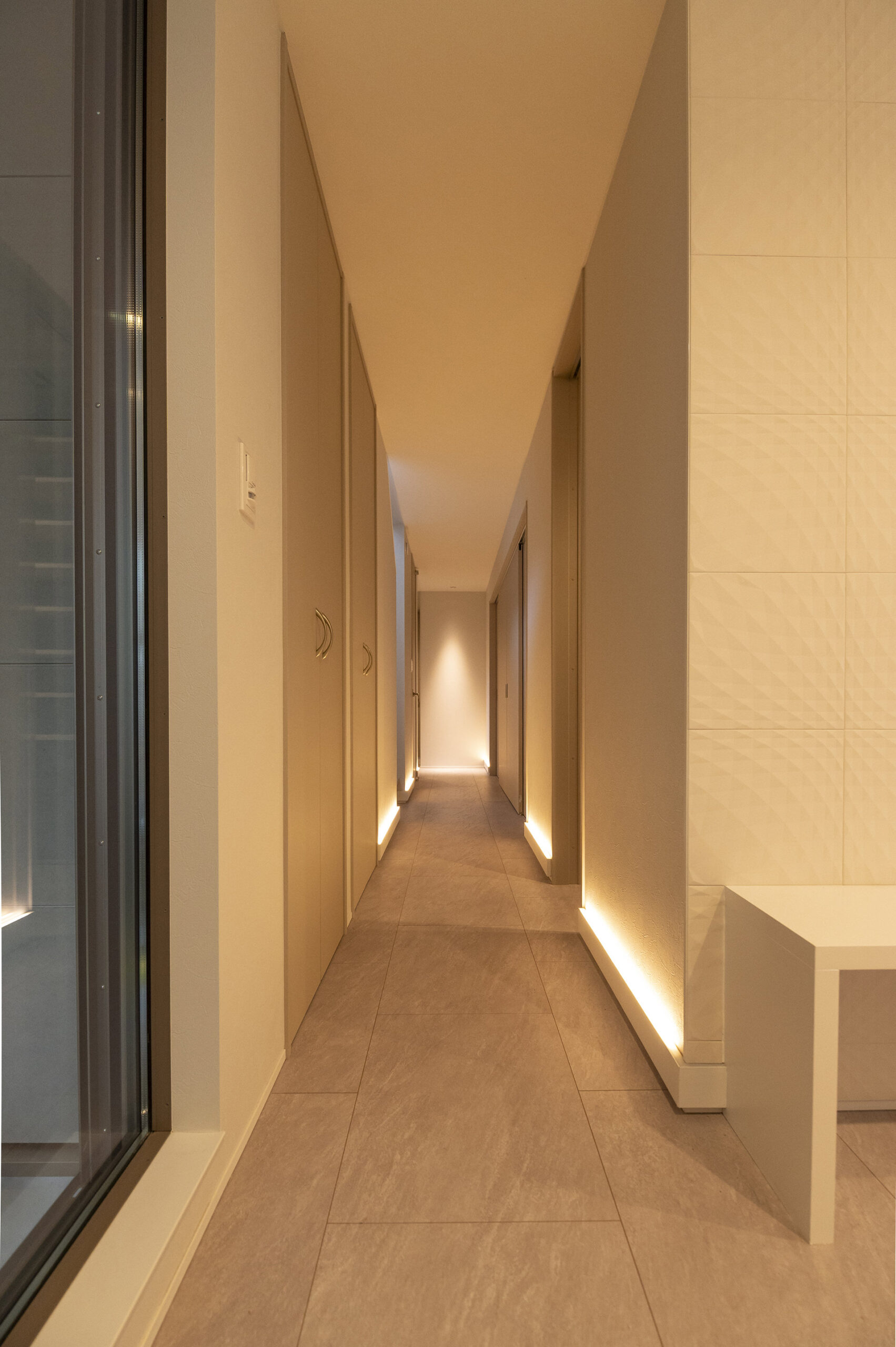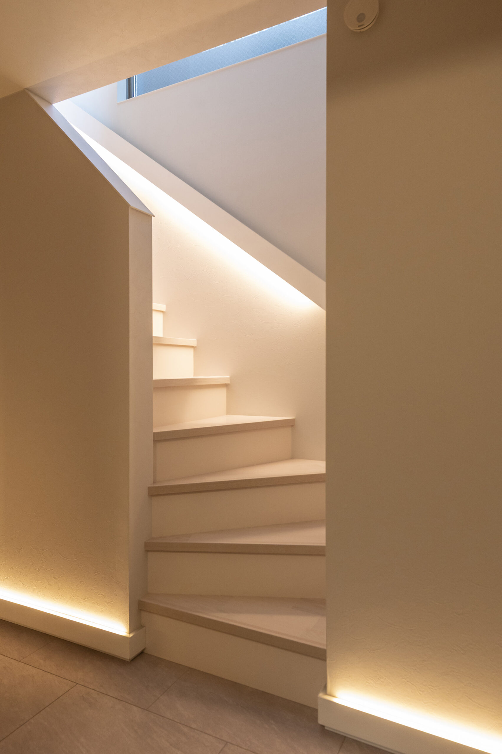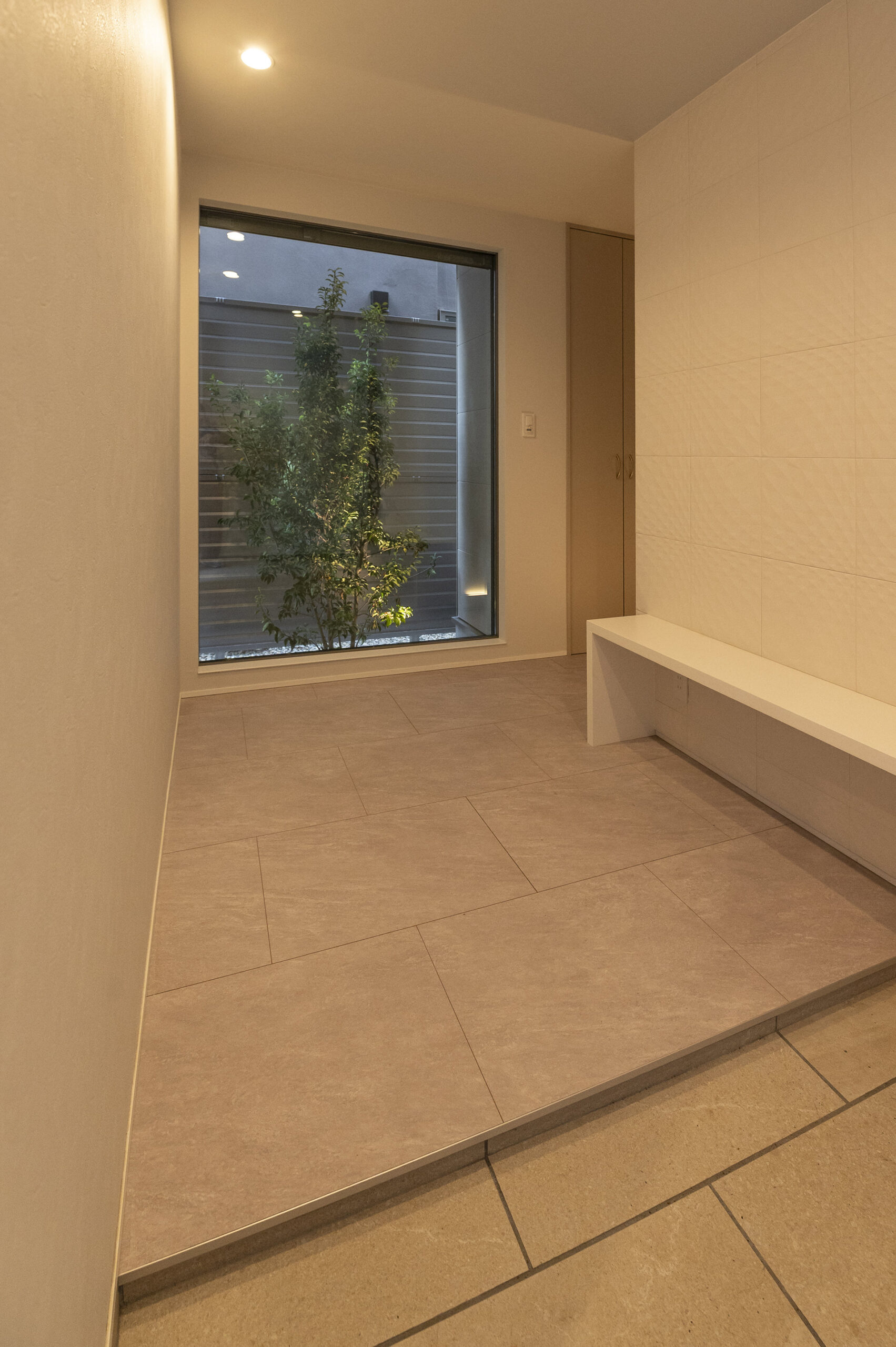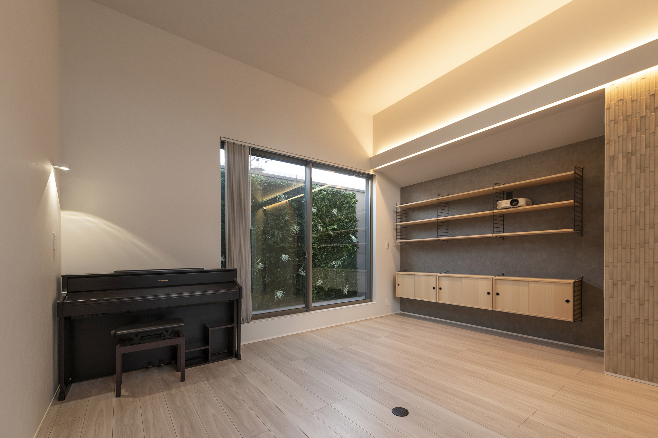 道路際と広めの玄関からのぞくシンボルツリー、2階バルコニーの壁面緑化、裏庭の家庭菜園まで、緑のレイヤーが暮らしの景色をつくります。目隠し壁でプライバシー性と防犯性を高め、周囲の視線を気にせず過ごせる落ち着きを確保しました。廊下や階段、リビングダイニングは間接照明を主役に据え、ゲストを温かく迎えるホテルライクな印象へ。旅先で印象的だったラグジュアリーホテルの内装を参考に、「家が“おかえり”と出迎える」照明計画を目指したエピソードも、この住まいの品格を象徴しています。