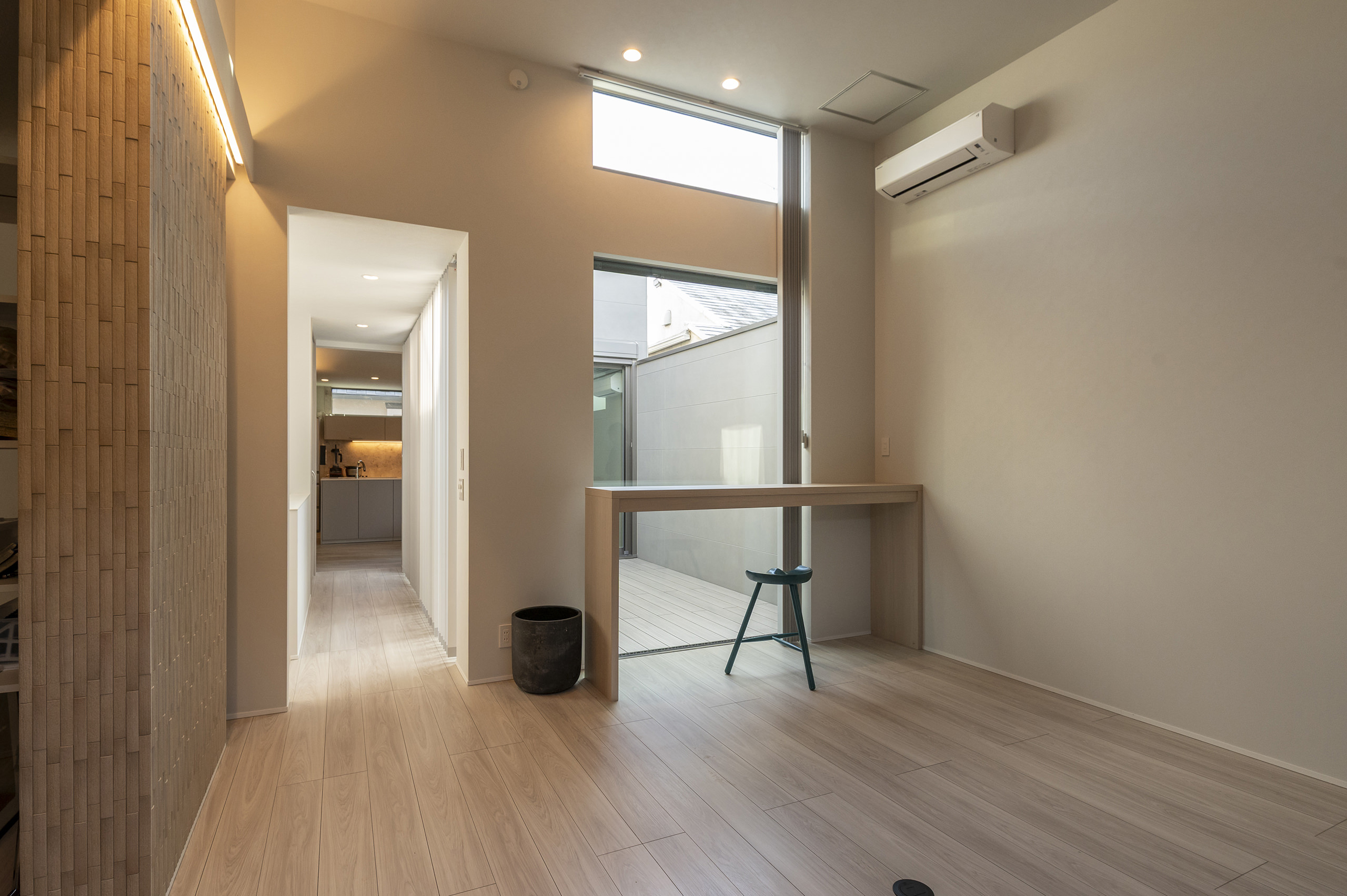 北側道路に面した2階建ての条件下でも2階LDKの中心に中庭を据えることで、光と空の気配が住まいの奥まで静かに届く構成としました。北側に置かれがちなリビングに十分な採光を確保し、日常の輪郭をやわらかく整えています。