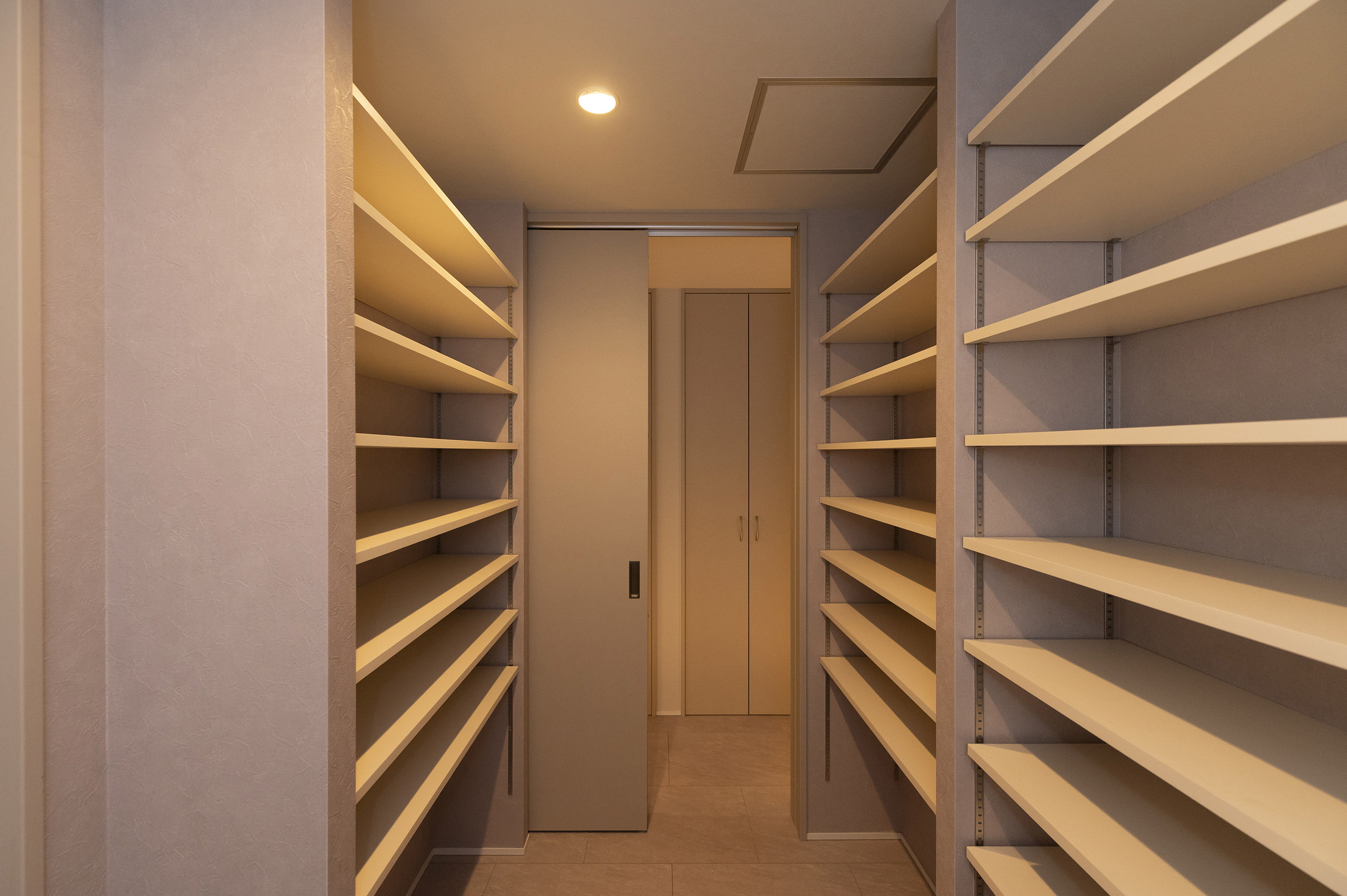 料理がお好きな奥様のためのキッチンは、ゆとりある作業性と眺めの豊かさを両立。中庭を眺めながら過ごせる配置とし、セミオーダーキッチンにフルオーダーの造作収納を組み合わせることで、コストバランスを丁寧に調整しながら、使いやすさ・収納量・デザインの理想を一つにまとめました。大きく確保したパントリーも、生活感を整え、空間の端正さを保つための重要な要素です。